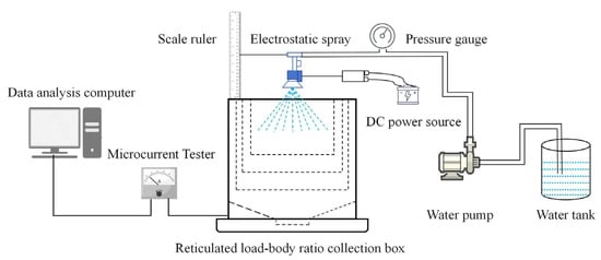 The droplet charge-to-mass ratio measurement experiments for electrostatic spraying were conducted at the College of Plant Protection Machinery, HARDI Factory, Heilongjiang Bayi Agricultural University. The charge-to-mass ratio of the electrostatic spray droplets was measured using a dedicated charge-to-mass ratio testing system. As illustrated in Figure 3, the system comprises an electrostatic spray test bench, a target grid droplet collection device, a microcurrent meter, a timer, and a computer.