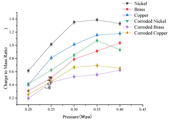 CoMparative analysis of charge variations across three metallic electrodes reveals that when spray pressure reaches 0.35 Mpa, nickel electrodes exhibit the smallest decline in the charge-to-mass ratio before and after corrosion. This indicates shorter liquid relaxation times when using nickel electrodes, whether pristine or corroded, enabling faster attainment of maximum charge-to-mass ratio and superior charging efficiency. In high-pressure, high-flow-rate spraying operations, nickel outperforms copper and brass as an electrode material. Post-corrosion, all electrodes showed a reduced charge-to-mass ratio: Nickel: 30% decrease in charge capacity after moderate corrosion. Copper and Brass: 40% reduction under similar corrosion conditions.