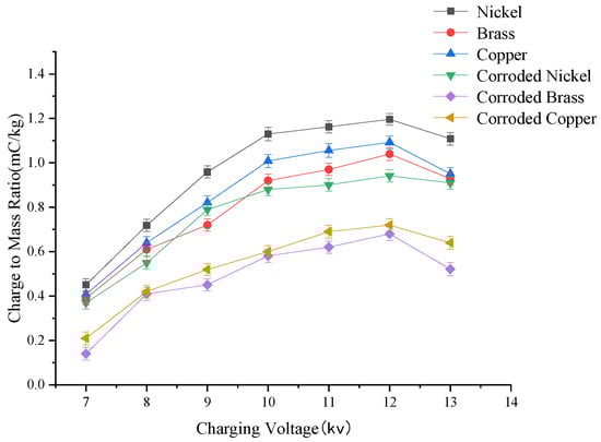 The variation curve of droplet charge-to-mass ratio under different charging voltages is shown in Figure 5. Single-factor experimental results demonstrate a positive correlation between the charge-to-mass ratio and charging voltage within the 7–12 kV range. However, beyond 12 kV, the charge-to-mass ratio exhibits a declining trend with further voltage increases. This phenomenon can be attributed to the Rayleigh limit of droplets and the reduced breakdown threshold of humid air at elevated voltages, both of which iMpair droplet charging efficacy. Post-corrosion, the charge-to-mass ratio decline becomes pronounced: Nickel: 20% reduction in charge-to-mass ratio after moderate corrosion coMpared to pristine electrodes. Copper and Brass: 40% decrease under similar conditions. These findings confirm that electrode corrosion severely degrades charge transfer capability.