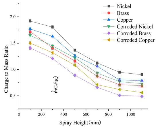 Fixed-point measurements were performed to assess variations in q/m across three electrode materials—nickel, brass, and copper—and their moderately corroded counterparts. The test plane was positioned vertically below the nozzle within a height range of 100–1100 mm. Spray height experiment: Charging voltage fixed at 10 kV and spray pressure at 0.30 Mpa. Spray pressure experiment: Charging voltage fixed at 10 kV, spray height at 500 mm, and pressure varied from 0.2 to 0.4 Mpa. Charging voltage experiment: Spray pressure fixed at 0.30 Mpa (typical operational value), spray height at 500 mm, and voltage adjusted from 7 to 13 kV. Testing conditions: Laboratory temperature, 18–21 °C; humidity, 64–69%.