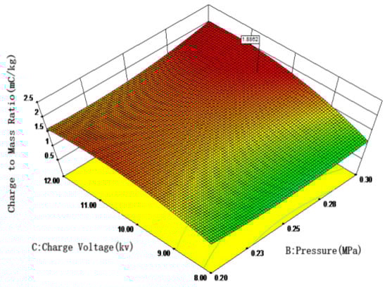 As shown in Table 3, the p-value of the droplet charge-to-mass ratio response model is <0.05, confirming the statistical significance of the established model. Based on the significance levels (p < 0.05) of individual factors in Table 3, the model was optimized by retaining only statistically significant factors. The optimized results are as follows: