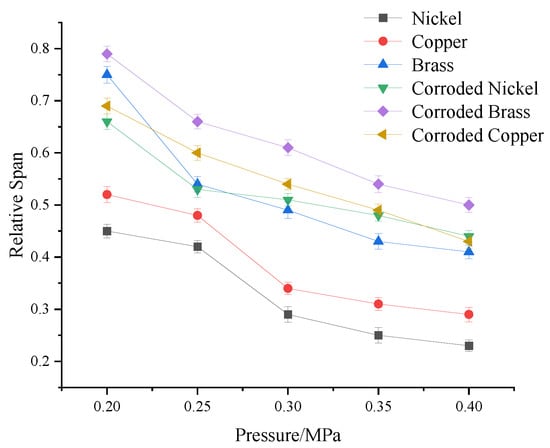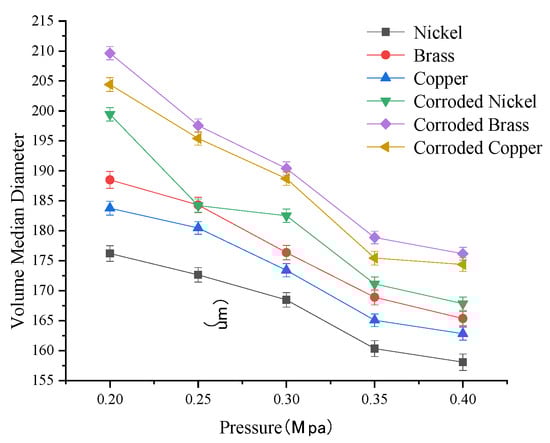 As shown in Figure 8, droplet size exhibits a negative correlation with spray pressure for both pristine and moderately corroded electrode materials. When spray pressure exceeds 0.35 Mpa–0.40 Mpa, the rate of droplet size reduction diminishes significantly coMpared to lower pressures (<0.35 Mpa), indicating that the influence of spray pressure on droplet size weakens beyond this threshold. Under identical operating conditions, droplet sizes can be ranked from smallest to largest across electrode materials as follows: nickel < copper < brass < moderately corroded nickel < moderately corroded copper < moderately corroded brass. Key findings: Nickel electrodes produced droplets 4.2–8 μm and 6.8–12.3 μm smaller than copper and brass electrodes, respectively. Nickel maintained the smallest droplet size even after moderate corrosion, outperforming corroded copper and brass electrodes.