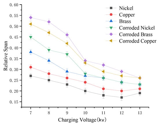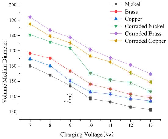 As shown in Figure 9, droplet size exhibits a negative correlation with charging voltage for both pristine and moderately corroded electrode materials. The correlation coefficients between voltage and droplet size for nickel electrodes before and after corrosion were −0.92 and −0.65, respectively, indicating the iMpact of corrosion on electrode performance degradation. Under identical operating conditions, droplet sizes can be ranked from smallest to largest as follows: nickel < copper < brass < moderately corroded nickel < moderately corroded copper < moderately corroded brass.