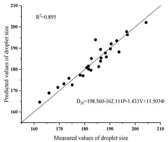 In practical plant protection spraying operations, the corrosion of metal electrodes is a continuous process, occurring both during and after spraying. Based on single-factor experimental results for spray uniformity, the moderate corrosion of electrodes significantly iMpacts droplet size and uniformity, with both parameters deteriorating (increased droplet size and reduced uniformity), thereby compromising spraying efficacy. To further investigate the magnitude and extent of factors influencing droplet size under different electrode materials, a multi-factor experiment was conducted with the following variables: independent variables: spray pressure, electrostatic voltage, and work function. Dependent variable: volume median diameter (Dv50). The experimental design and results are detailed in Table 4. Using multiple linear regression on the data from Table 4, the droplet size regression model and its predictions are illustrated in Figure 12. Coefficients of the fitted equation are listed in Table 5, and the analysis of variance (ANOVA) for model significance is provided in Table 6.