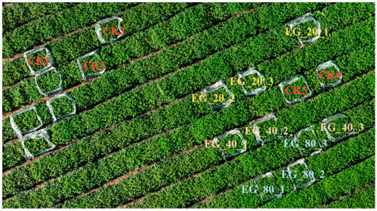 This experiment was conducted at the Tea Research Institute of the Hangzhou Academy of Agricultural Sciences, located in a well-managed and generally healthy tea plantation in Hangzhou City. The geographical coordinates of the experimental site are 30°11′0″ N latitude and 120°4′8″ E longitude. The researchers set up 14 rectangular enclosures, each measuring 1.5 × 2 m, using wire mesh, as shown in Figure 1. Starting at noon on 12 September 2024, 500 tea geometrids (2nd–3rd instar) were subjected to starvation treatment. Prior to introducing the larvae, we carefully inspected the selected plots and confirmed that only a few leaves showed signs of prior herbivory. These leaves were removed, and the area was enclosed with wire mesh to prevent the entry of other pests. At 9:00 PM that day, the tea geometrids were placed into the corresponding enclosures as shown in Figure 1. The EG_20 enclosure contained 20 tea geometrids, EG_40 contained 40 tea geometrids, and EG_80 contained 80 tea geometrids, while the CK enclosure served as the blank control. On the following morning, before data collection, we conducted another thorough inspection and manually removed all visible larvae. To ensure that any differences in herbivory were not confounded by natural variation in the tea plants themselves, two additional CK enclosures (CK4 and CK5) were placed between the herbivory treatment enclosures, and the enclosures for the same geometrid density gradients were distributed across different tea plots.