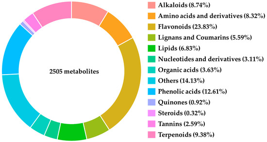 Metabolomic analysis was conducted on samples collected on the sixth day, resulting in the identification of 2505 distinct metabolites, including Alkaloids, Amino Acids and Derivatives, Flavonoids, Lignans and Coumarins, Lipids, Nucleotides and Derivatives, Organic Acids, Phenolic Acids, Quinones, Steroids, Tannins, and Terpenoids (Figure 2).