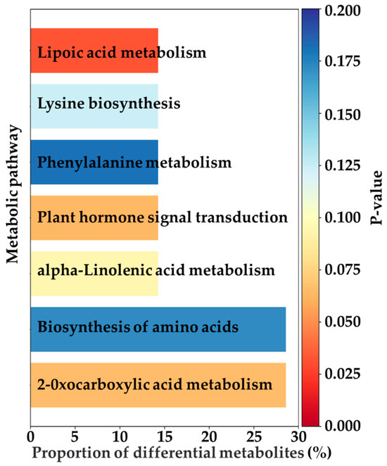 This study further investigated the differential metabolites and identified 49 common differentially expressed metabolites across the three EG treatments (EG_20, EG_40, EG_80) compared to the CK group (Table 2). These metabolites were consistently upregulated or downregulated across all EG treatments. They primarily belonged to the categories of terpenoids, fatty acids, alkaloids, and flavonoids. These metabolic changes are supported by previous research findings. Specifically, monoterpenes and sesquiterpenes are key components of plant volatiles, playing crucial roles in the long-distance host location of herbivorous insects and their natural enemies. Some terpenes can directly repel ovipositing adults, while certain oxygenated derivatives are capable of attracting predators of pests [22]. Fatty acids (linoleic acid and α-linolenic acid) are closely linked to the jasmonic acid (JA) signaling pathway, often participating in the synthesis and metabolism of JA, which is vital to insect resistance in plants [23]. Alkaloids serve a variety of biological functions, such as interfering with insect enzyme activity, altering physiological processes, inhibiting DNA synthesis and repair, or significantly affecting the insect nervous system [24]. Plants increase the production of flavonoids, including chalcones and anthocyanins, by upregulating genes such as chalcone synthase in the flavonoid biosynthesis pathway. This response helps eliminate excess reactive oxygen species and inhibits the growth and development of herbivorous insects [23]. Figure 4 illustrates 20 of these common differential metabolites, notably showing that 88.8% of them were upregulated. The Variable Importance in Projection (VIP) score is a statistical metric commonly used in metabolomics [25]. A metabolite is considered to exhibit a significant change in response to treatment when its VIP score exceeds 1. Subsequently, this study analyzed the pathways associated with metabolite changes induced by tea geometrid feeding (Figure 5). The upregulated metabolites were mainly enriched in pathways including lipoic acid metabolism, lysine biosynthesis, phenylalanine metabolism, plant hormone signal transduction, α-linolenic acid metabolism, amino acid biosynthesis, and 2-oxocarboxylic acid metabolism. Among these, significant enrichment in the α-linolenic acid pathway is directly related to the activation of plant hormone signaling, thereby regulating the expression of defense-related genes. Activation of the phenylalanine metabolism pathway provides precursors for the biosynthesis of insect-resistant compounds such as flavonoids and lignin. The overall activation of amino acid biosynthesis not only supports the production of defensive substances but may also enhance leaf nitrogen content, potentially altering nutritional quality and indirectly affecting insect palatability [23].