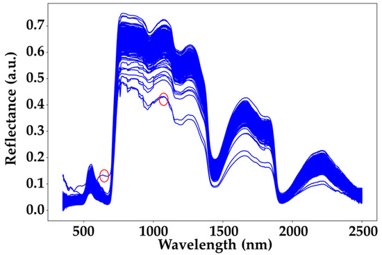 ASD spectra chart. The blue curve represents all the collected spectral data, while the red circles indicate the outlier spectra.