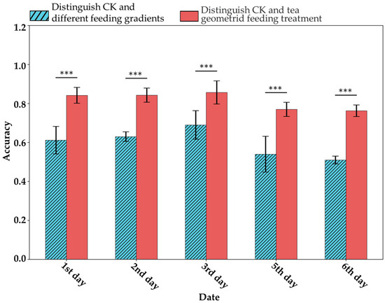 Under this hypothesis, this study attempted to distinguish VIS-NIRS of leaves under different pest density treatments, with the results shown in Figure 7. It was observed that on the second and third days, the VIS-NIRS performed best in distinguishing between the CK, EG_20, EG_40, and EG_80 groups (the blue striped bar). However, by the fifth and sixth days, the ability of VIS-NIRS to distinguish between different treatments significantly decreased. This could be due to the diminishing effects of the treatments on the plants over time, leading to a gradual disappearance of spectral differences in the leaves [28,29]. Figure 8 presents the confusion matrix for distinguishing treatments based on VIS-NIRS across different days. It can be seen that from the third day onward, distinguishing the CK group from the other treatment groups became more difficult. This may be because, starting on the third day (15 September), the weather in the tea garden changed noticeably (Table 1), making it harder to differentiate between EG_20, EG_40, and EG_80 [30]. Attempting to forcefully distinguish these three treatments could lead the model to learn incorrect features, making it more challenging to differentiate between the CK and EG treatment groups. However, when all EG treatment groups were combined into one category, the model was able to more effectively distinguish between the CK and EG groups across all days (the red bar of Figure 7 and Figure 9), with the best average classification accuracy of 0.857 (Table 4).