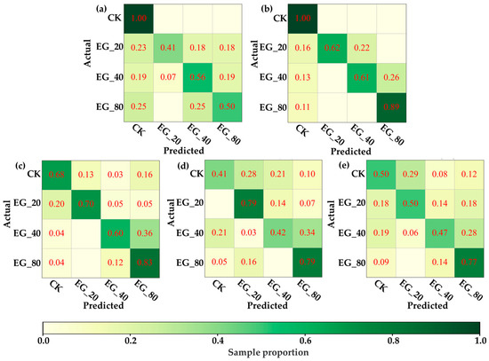 The confusion matrix of the optimal model distinguishing CK, EG_20, EG_40, and EG_80 based on ASD spectra. (a) Distinguish by the first day ASD spectrum. (b) Differentiation by next-day ASD spectrum. (c) Distinguish by the third day ASD spectrum. (d) by the fifth day ASD spectrum. (e) Distinguish by the sixth day ASD spectrum.