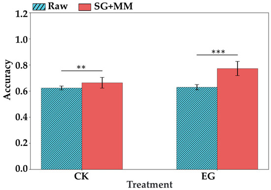 ASD spectra combined with spectral preprocessing were used to distinguish the accuracy of CK group and EG group at different times. The length of the error bar indicates the standard deviation. ** indicates p < 0.01, and *** indicates p < 0.001 based on t-test results.