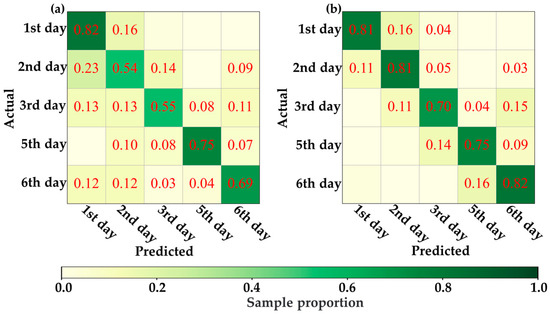 Confusion matrix of the best model for distinguishing time based on ASD spectral data. (a) CK group and (b) EG treatment.