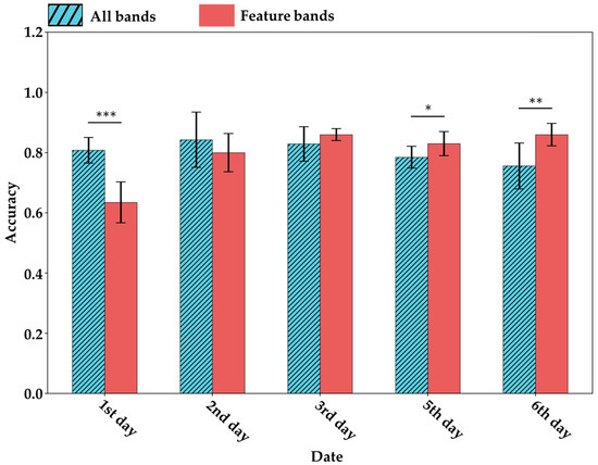 Under the selection of feature bands, the average accuracy (bar) and standard deviation (error bar) of the valid set for distinguishing CK and EG at the same time. * indicates p < 0.05, ** indicates p < 0.01, and *** indicates p < 0.001 based on t-test results.