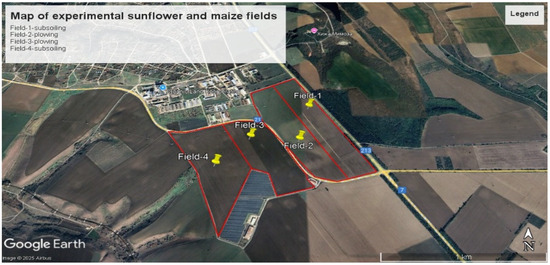 During the 2023–2024 agricultural season, sunflowers were cultivated on both Field 1 and Field 2. On Field 1, subsoiling was implemented as the primary tillage method, while Field 2 underwent conventional deep plowing. Maize was sown on Field 3 and Field 4, with plowing applied to Field 3 and subsoiling to Field 4. Wheat was cultivated on Field 5 and Field 6. On Field 5, subsoiling was employed as a secondary soil preparation technique, whereas Field 6 was managed using disk harrowing.