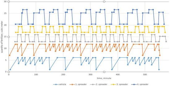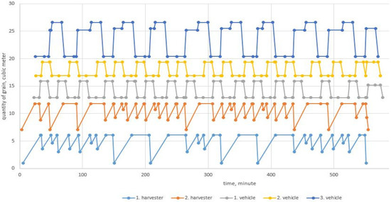 The second tool estimates the degree of consistency between the interacting technological and transport machinery. In addition to the field capacity of the entire machine complex, its time efficiency was also used for evaluation. A simulation model was used as the basis for the calculations [53]. The input data includes distances, terrain type, transshipment time, loading and unloading times, working speed, and load capacity for each agricultural and transport unit. Some of these parameters, such as speed and time, can be represented as discrete or quasi-random values. Typically, a generator of normally distributed values based on experimental data is used for this purpose.