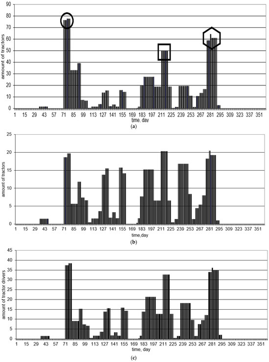 The case study in Kalipetrovo demonstrated that significant resource savings can be achieved—such as a 3.5-fold reduction in tractor requirements and improved workload distribution—by applying structured information management and scheduling strategies. Figure 3, Figure 4 and Figure 5 illustrate how information flows from technical data to strategic planning, validating the hierarchical model’s capacity to support integrated machinery decisions.