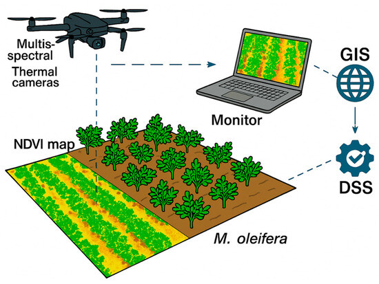 In the Mediterranean basin, characterized by semiarid conditions, high evapotranspiration, and fragmented land use, the implementation of smart agricultural technologies is especially critical. The region faces growing vulnerabilities due to climate variability, necessitating adaptive cropping systems that enhance both productivity and sustainability. A promising candidate for such systems is Moringa oleifera Lam., a fast-growing, drought-tolerant plant known for its high nutritional and functional value [10,11,12,13]. The species has gained recognition for its adaptability to marginal environments and its potential to contribute to food and nutrition security, particularly in water-limited regions.