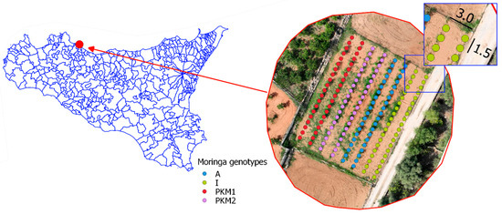 On July 3, 2024, one-month-old M. oleifera seedlings were transplanted into the experimental field located in Santa Flavia (Palermo, Italy) at the Cooperativa Agricola Primo Sole (Lat 38°05′14.11″ N, Long 13°31′39.67″ E; WGS 84, 130 m a.s.l). The region has a Csa climate classification according to the Köppen–Geiger system, indicating a hot-summer Mediterranean climate [20]. The soil moisture regime is xeric, bordering aridic, with a thermic temperature regime.