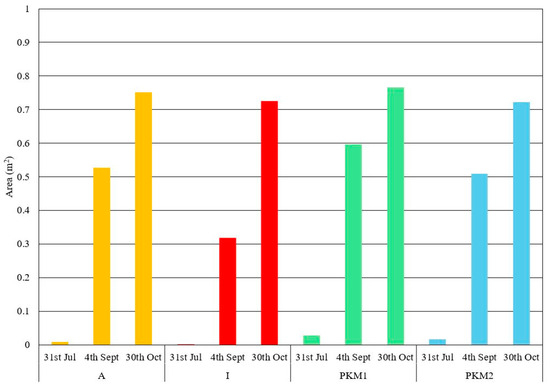 Figure 4 illustrates the estimated canopy projection of four M. oleifera genotypes—African (A), Indian (I), Pakistani PKM1, and Pakistani PKM2—over three UAV monitoring dates during the 2024 season. The surface area was derived from multispectral image analysis and represents the horizontal projection of canopy cover (in square meters) at ground level. Across all genotypes, a consistent increase in canopy surface area is evident between July and October, with PKM1 and PKM2 showing the most extensive coverage by late October. The African and Indian genotypes also exhibited substantial growth, although the Indian genotype showed a more moderate increase. On average, on 30 October, all plants have a projection area of around 0.7–0.75 m2 with minimal differences (Min 0.72–Max 0.77). These canopy projections are important indicators of biomass accumulation and are used in conjunction with NDVI data to inform optimal harvest timing [51].