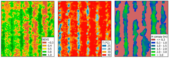 The combination of these three maps allows for a nuanced discrimination of crop crowns from weeds and soil, enhancing monitoring accuracy. Notably, the correlation between NDVI and Land Surface Temperature (LST) is clearly evident: areas with higher NDVI values correspond with reduced surface temperatures. This inverse relationship is extensively documented in the scientific literature and plays a critical role in climate modeling, crop phenotyping, and environmental monitoring.