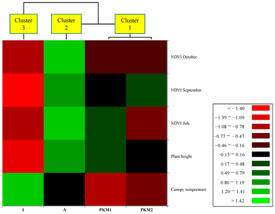 Distribution of canopy temperature, plant height, and NDVI values (July, September, and October) among four Moringa oleifera genotypes. Abbreviations: A, African genotype; I, Indian genotype; PKM1, Pakistani M1 genotype; PKM2, Pakistani M2 genotype. The heat map plot depicts the relative intensity of each variable (variables clustering on the y-axis) within each genotype (x-axis clustering).
