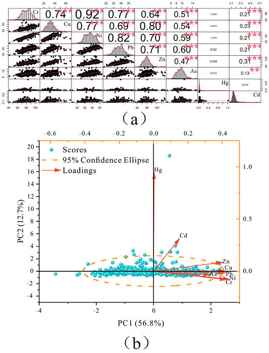 Scatter map of soil heavy metal correlation in study area: (a) scatter plot of the correlation matrix; (b) principal component score plot.