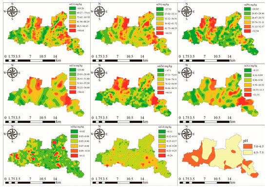 The spatial distribution of heavy metal elements can be used to visualize the distribution characteristics of these elements and their correlations [25]. The spatial distribution of heavy metals in the study area is illustrated in Figure 3. This distribution can be categorized into four groups. (1) The spatial distribution characteristics of Cr, Ni, and Pb show very high similarity, with areas with a relatively high content and areas with a relatively low content distributed in a strip-like manner. (2) The spatial distribution of Cu, Zn, and As also exhibits high similarity, with areas with a relatively high content coinciding with agricultural land in the multi-study area. (3) The spatial distribution of Hg differs from that of the other elements; its areas with a relatively high content are coherent in a certain direction and exhibit a low–high–low trend. (4) The distribution of Cd is also different from that of other elements; its area with a relatively high content is mainly located on the right side at the center middle part of the study area as well as a small region in the southern part; this central area serves as the administrative center for the town crossed by provincial highways and has a higher population density that is likely related to traffic activities. Lastly, the pH values are mostly close to neutral, except for the weakly acidic conditions found in western parts.