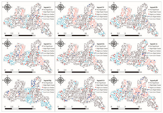 A comprehensive analysis of the distribution characteristics of the spatial aggregation types of the eight heavy metal elements in the study area showed that the high–high aggregation types of Cr, Ni, Pb, Cu, Zn, As, and Cd were mainly distributed in the northwestern and southeastern parts of the study area, whereas the low–low aggregation types were primarily found in the western part. The spatial aggregation type of Hg has complex characteristics; it is mainly a low–low aggregation type, while its high–high aggregation types are more pronounced. The spatial aggregation characteristics of various heavy metal elements in the study area exhibit similar distributions that are primarily controlled by two factors: anthropogenic and natural influences.