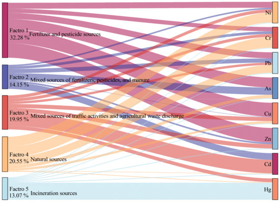 Factor 1 made a high contribution to Cu and Zn, with contributions of 65.9% and 68.8%, respectively. Comprehensive previous studies have found that the sources of Cu and Zn are mainly related to regional rock distribution, the use of chemical fertilizers and pesticides, and the discharge of sewage/wastewater [32,33,34]. The study area is a typical farming zone; therefore, the sources of Cu and Zn are more likely related to the use of chemical fertilizers and pesticides. The long-term application of these substances can lead to the serious accumulation of heavy metal elements in the soil. The high-value areas for Cu and Zn were mostly distributed along rivers where agricultural production was more active. The presence of rivers facilitates spraying pesticides and applying fertilizers. Additionally, greenhouse planting occurs in areas with relatively high Cu and Zn contents, as this method requires large amounts of chemical fertilizers and pesticides. Therefore, this study suggests that the source of Cu and Zn in the study area may be linked to fertilizer and pesticide usage in agricultural activities.