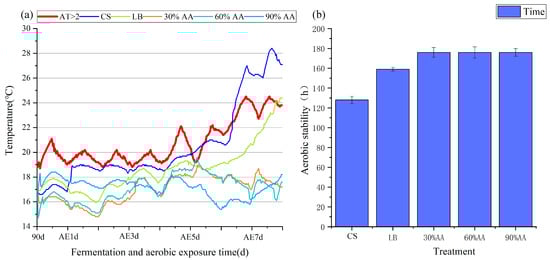 Changes in temperature (a) and aerobic stability (b) were monitored. AE1 d, AE3 d, AE5 d and AE7 d, aerobic exposure for 1, 3, 5 and 7 days after ensiling 90 days, respectively.