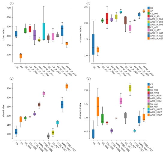 The microbial Alpha diversity indices are presented in Figure 2. Concerning the bacterial community (Figure 2a,b) of the fresh samples, the statistical analysis revealed that the CS samples possessed significantly elevated Chao and Shannon indices in comparison with the AA-treated samples. After 90 d of fermentation, the LB group had the highest Chao index, but all the AA treatment groups exhibited Chao indices at lower levels with no significant differences; the Shannon index of the 30% AA group was the lowest. After 7 d of aerobic exposure, the Chao index of the 90% AA group was significantly lower than that of the other treatment groups, with the LB group having the lowest Shannon index followed by the 30% AA group. Concerning the fungal community (Figure 2c,d) in fresh samples, the Chao and Shannon indices of AA were higher than those of the CS group. After 90 d of fermentation, the Chao index was highest for the 90% AA group and the Shannon index was lowest for the 30% AA group. On the 7th d of aerobic exposure, the Shannon index was lowest for the 30% AA and highest for the LB group.