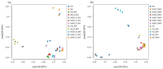 The results of the PCoA analysis at the OTU level are presented in Figure 3. Concerning the bacterial community (Figure 3a), before fermentation, there was a considerable distance between the CS and AA groups in the fresh samples, indicating a significant difference in bacterial community structure. After 90 d of fermentation, the distance between the CS and LB groups was smaller, suggesting a higher level of similarity in microbial composition. The 30% AA had a greater distance from all other treatment groups, indicating substantial differences in microbial species. After 7 d of aerobic exposure, the distance between all AA treatment groups was smaller, demonstrating a convergence in bacterial community structure at a notable distance from the CS and LB treatment groups. Concerning the fungal community (Figure 3b), there was a smaller distance between the CS and AA groups in the fresh samples, indicating a higher level of similarity in fungal community structure. By the 90 d of fermentation, the distance between all the treatment groups was smaller, suggesting a similar fungal community structure. After 7 d of aerobic exposure, the groups with AA addition were at a greater distance from the CS and LB groups, indicating a significant difference in their fungal community structure.