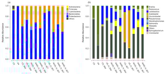 The microbial phylum distribution depicted in Figure 4a. In the fresh samples, before fermentation, both the CS and AA groups were dominated by Proteobacteria. After 90 d of fermentation, all experimental groups demonstrated elevated Firmicutes prevalence, with the highest relative abundance found in the 90% AA group (40.23%), followed by the 30% AA group with a relative abundance of 37.56%. Over time and with increasing aerobic exposure, the relative abundance of Proteobacteria increased in the CS and LB groups, becoming the dominant microbes. The relative abundance of Firmicutes in all AA treatment groups increased compared to the 90 d of fermentation, with the 30% AA group having the highest relative abundance of Firmicutes, at 48.52%, among all the treatment groups.