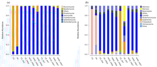 Figure 5a illustrates the fungal phylum levels, showing that the dominant microorganisms in the fresh samples of the CS and AA groups were Basidiomycota. After 90 d of fermentation, the relative abundance of Ascomycota increased in all treatment groups, although the relative abundance of Basidiomycota in the 90% AA group was significantly higher than in all other treatment groups (p < 0.05). Following 7 d of aerobic exposure, the relative abundance of Ascomycota in all treatment groups showed a non-significant increase.