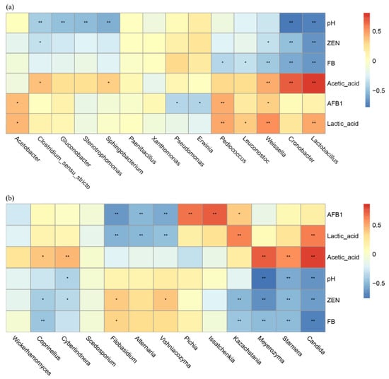 Genus level microbial associations with fermentation dynamics: bacteria (a) and fungi (b). Positive correlations are shown in red, and negative correlations are shown in blue. * means p < 0.05 and ** means p < 0.01.