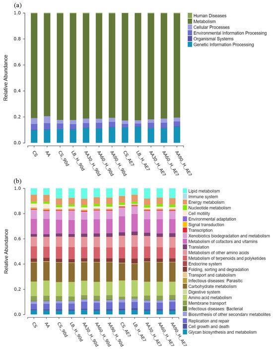 As shown in Figure 7, in the functional annotation of KEGG level 1 (a), all treatment groups during the ensiling and aerobic exposure stages had the highest relative abundance annotated to metabolic functions. In the functional annotation of KEGG level 2 (b), for the metabolic pathway of cofactors and vitamins, the relative abundance for the fresh materials in the CS and AA groups in fresh materials was approximately 12.09% each. After 90 d of fermentation, this relative abundance decreases in all treatment groups. With an increasing amount of aerobic exposure time, both the CS and LB groups showed an increasing trend in relative abundance, reaching 12.81% and 13.99%, respectively, while the 30% AA group had the lowest relative abundance (10.69%). Regarding lipid metabolism, the relative abundance in the CS and LB groups was 5.03% and 5.11%, respectively. After 90 d of fermentation, the relative abundance increased in all treatment groups, with 30% AA having the highest relative abundance (8.18%). After 7 d of aerobic exposure, the relative abundance decreased for CS (5.98%) and LB (5%), while 30% AA still had the highest relative abundance (8.12%). Regarding the carbohydrate metabolism pathway, during the 90 d of fermentation, the relative abundance for all the treatment groups was higher than that for the fresh samples. After 7 d of aerobic exposure, the relative abundance decreased for the CS and LB groups, and there was no significant difference in relative abundance for the AA groups compared to the abundance following the 90 d fermentation stage.