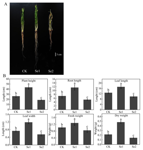 Impact of selenium (Se) treatment on the growth of highland barley seedlings. (A) The phenotype. (B) Effects of the growth indicators. The vertical bars represent the standard deviation of three replications. Different lowercase letters above the bars indicate a significant difference at p < 0.05. CK: control group; Se1: 0.02 g/kg Na2SeO3 treatment; Se2: 0.2 g/kg Na2SeO3 treatment.