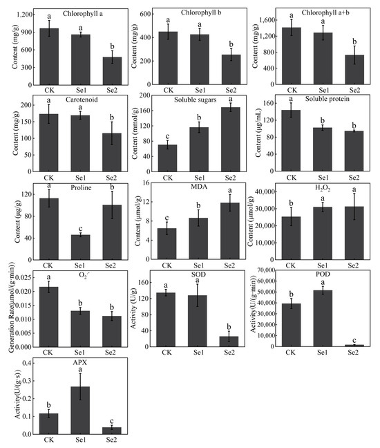 Physiological index changes of highland barley seedlings under Se treatments. The vertical bars represent the standard deviation calculated from three replicates. Different lowercase letters positioned above the bars indicate a statistically significant difference at p < 0.05. CK: control group; Se1: 0.02 g/kg Na2SeO3 treatment; Se2: 0.2 g/kg Na2SeO3 treatment.