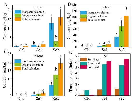 Compared to the control group, the content of inorganic selenium was increased from 0.04 mg/kg to 35 mg/kg, organic selenium was increased from 0.06 mg/kg to 70 mg/kg, and total selenium was increased from 0.103 mg/kg to 105 mg/kg in the leaves under Se2 treatments (p < 0.05, Figure 3B). Similarly, the content of inorganic selenium was increased from 0.04 mg/kg to 7 mg/kg, organic selenium was increased from 0.07 mg/kg to 13 mg/kg, and total selenium was increased from 0.103 mg/kg to 20 mg/kg in the roots under Se2 treatments (p < 0.05, Figure 3C).