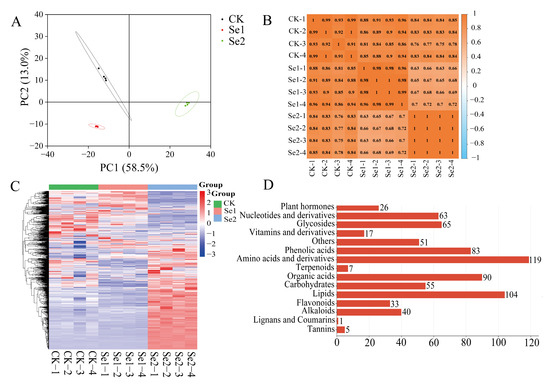 Metabolomics analysis of highland barley seedlings under selenium treatment. (A) PCA analysis. (B) Correlation analysis. (C) Accumulation patterns of 759 identified metabolites. The color gradient represents the accumulation levels of each metabolite, ranging from low (blue) to high (red). (D) Types and quantities of all annotated metabolites in highland barley seedlings. CK: control group; Se1: 0.02 g/kg Na2SeO3 treatment; Se2: 0.2 g/kg Na2SeO3 treatment.