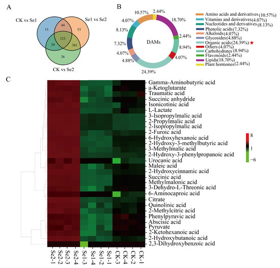 Metabolomic analysis of highland barley seedlings under selenium treatments. (A) Pairwise comparisons of metabolites among different groups, where the overlapping sections indicate the number of metabolites common to the compared groups, while the non-overlapping sections represent the number of metabolites unique to each comparison group. (B) The types and proportions of coexisting differential metabolites among the three groups. (C) The heatmap of differentially expressed organic acid metabolites, with a color gradient indicating accumulation levels; green represents low levels, and red indicates high levels. CK: control group; Se1: 0.02 g/kg Na2SeO3 treatment; Se2: 0.2 g/kg Na2SeO3 treatment. ★: organic acid.