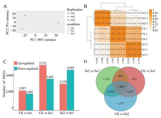 To gain a comprehensive understanding of the transcriptomic changes in highland barley seedlings under varying selenium concentrations, transcriptome sequencing was conducted using the same samples as in the metabolomic analysis to assess gene expression alterations across the CK, Se1, and Se2 groups. Nine libraries were constructed, and after the removal of adapter-containing and low-quality reads, an average of approximately 47.85 million clean reads per library was obtained. The Q30 values for each library exceeded 96.14%, with over 94.81% of the clean reads mapping to the highland barley reference genome, indicating that the quality of the transcriptome data was sufficiently high for subsequent analyses (Table S4). To preliminarily examine the transcriptional differences between the non-treatment control and selenium treatments, principal component analysis (PCA) based on RNA-seq data was performed. The first principal component accounted for 90% of the variance among the samples, effectively distinguishing CK from Se1 and Se2. The second principal component explained 9% of the variance, leading to a notable spatial separation of CK and Se2 from Se1 (Figure 6A). Additionally, the Pearson correlation coefficient demonstrated a strong correlation within the CK, Se1, and Se2 treatment groups (Figure 6B). The correlation coefficient within the same treatment ranged from 0.99~1, while the correlation coefficient between different treatments ranged from 0.64~0.85 (Figure 6B).