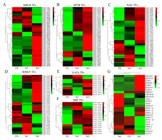 DEGs heatmap of transcription factors in highland barley seedlings under selenium concentrations. (A) bHLH family. (B) MYB family. (C) NAC family. (D) WRKY family. (E) GATA family. (F) HSF family. The color gradient indicates the expression levels of transcription factors, with red representing up-regulated genes and green indicated down-regulated genes. (G) The differential expression of 26 DEGs. CK: control group; Se1: 0.02 g/kg Na2SeO3 treatment; Se2: 0.2 g/kg Na2SeO3 treatment.
