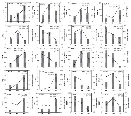Among these genes, the expression levels of bHLH49, HSFA-2c, MYB3R-2, and MYB61 increased with rising selenium concentrations. In contrast, the expression levels of NAC8, NAC74, HSFA-3, HSFA-4d, MYBAS2, and WRKY71 decreased. Notably, the expression of bHLH168, bHLH130, NAC4, NAC71, HSFA-2e, GATA25, and WRKY2 first increased and then decreased.