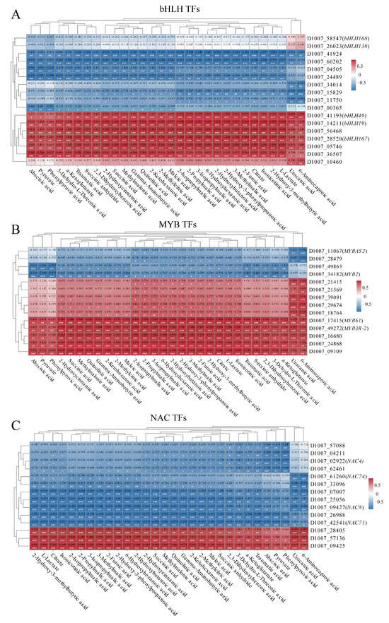 In our study, we identified a total of 89 positive correlations and 272 negative correlations between 30 organic acid compounds and 14 NAC transcription factor genes (p < 0.05, p < 0.01, p < 0.001). Notably, the transcripts D1007_28405, D1007_57136, and D1007_09425 exhibited significant positive correlations with 29 to 30 organic acid compounds. Conversely, transcripts such as D1007_02922 (NAC4), D1007_62461, D1007_61260 (NAC74), D1007_33096, D1007_07007, D1007_25056, D1007_09427 (NAC8), D1007_26988, and D1007_42541 (NAC71) demonstrated significant negative correlations with 18 to 30 organic acid compounds (Figure 9C).