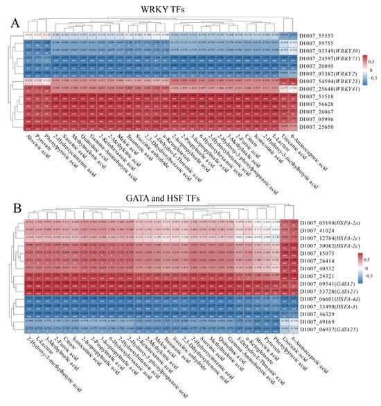 In this study, we identified 141 positive correlations and 129 negative correlations between 30 organic acid compounds and 15 GATA and HSF transcription factor (TF) genes (p < 0.05, p < 0.01, p < 0.001). Notably, the transcripts D1007_30082 (HSFA-2c), D1007_15075, D1007_26414, D1007_24321, D1007_09541 (GATA2), and D1007_53728 (GATA21) exhibited significant positive associations with 13 to 30 organic acid compounds. In contrast, transcripts D1007_06601 (HSFA-4d), D1007_33490 (HSFA-3), D1007_46329, and D1007_06937 (GATA25) demonstrated significant negative relationships with 28 to 30 organic acid compounds (Figure 10B).