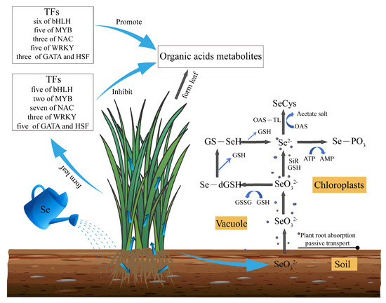 Possible roles of plants, transcription factors, and organic acid metabolites in highland barley seedlings under selenium treatment.