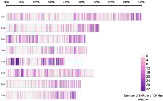 The final SNP panel comprised 2342 markers, which were distributed on the eight chromosomes of P. salicina (Figure 1) with an average of 292.75 SNPs per chromosome, and an average minimum and maximum distances between SNPs of 4.375 bp and 33.06 Mbp, respectively (Table 1). The highest SNP count was observed on chromosome 1 (Chr1; n = 400 SNPs), which accounted for approximately 17% of the total SNPs, while the lowest marker count was located on chromosome 4 (Chr4; 9.2%; n = 216 SNPs).