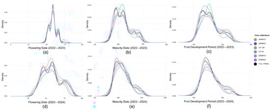Distribution plot of all phenotypic traits. The x-axis of the graph represents the Julian days for each trait measured for the individuals in the full panel and the core collections (CV99, CV100, ANRM15, ANRM20, ENMR15, and ENMR20), represented by different colors, while the y-axis shows the relative density of the samples. The FWD, MD, and FDP were evaluated on the original population and compared with the constructed core collections. On the top, season 2022–2023; bottom, season 2023–2024. (a,d) Flowering date (FWD); (b,e) maturity date (MD); (c,f) fruit development period (FDP).