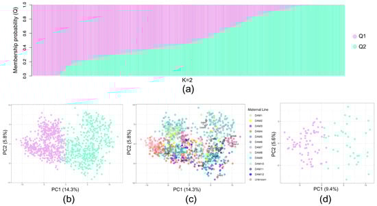 Population structure and principal component analysis (PCA) results based on 2342 high-quality SNPs. (a) The inferred population structure of the 1062 individuals of the original population for two genetic clusters (K = 2). The x-axis displays the individuals (1062) arranged according to their membership probability (y-axis; Q), with Q1 (light purple) and Q2 (aquamarine) representing the two distinct clusters. (b) The genetic PCA for all individuals (1062), distributed in the coordinates generated on the first two components. Each individual is assigned to Q1 or Q2, in concordance with the previous plot. (c) The former PCA, highlighting the parentals (PL: paternal line) used in the breeding program to generate 44 families, with their descendants colored by their maternal origin (DAM). (d) Genetic PCA of the 108 individuals comprising the ENMR15 core collection, colored by their cluster assignment (as illustrated in plot a).